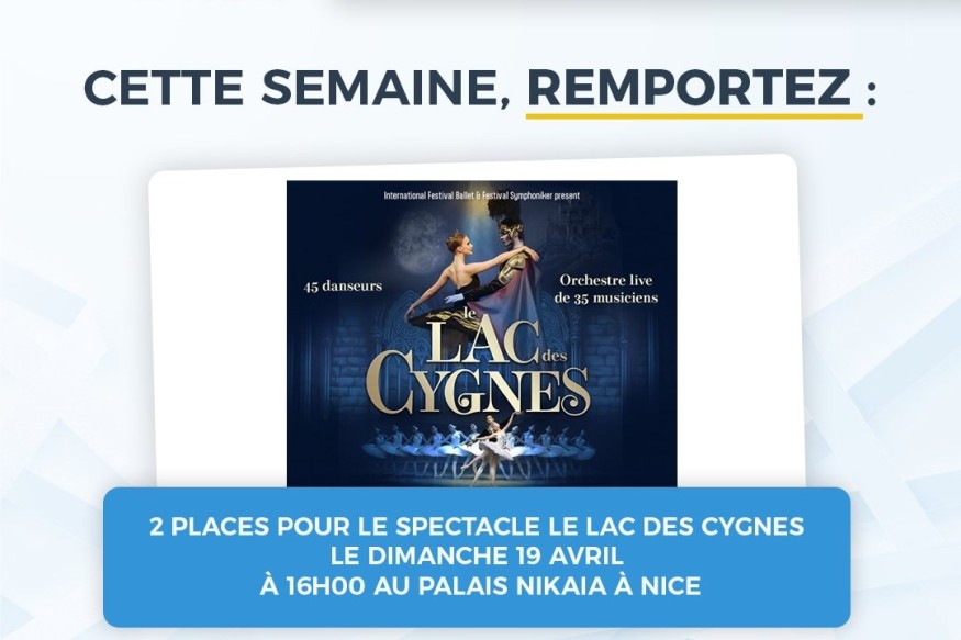 [JEU CONCOURS FACEBOOK - CANNES LERINS TV ET RADIO] Du 30/03/2026 au 03/04/2026, tentez de gagner 2 places pour le spectacle Le Lac Des Cygnes le 19 avril au Palais Nikaia ! Pour participer : "Aimez" cette publication et "identifiez 5 amis" en commentaire. "Abonnez vous" à notre page. Répondez à la question : Dans ce conte romantique comment s'appelle le prince et la princesse ? 1) Harry et Meghan 2) Albert II et Charlène 3) Siegfried et Odette 2 places seront tiré au sort parmi les bonnes réponses et attribuées à 1 gagnant le 03/04/2026. Jeu réservé à la...
