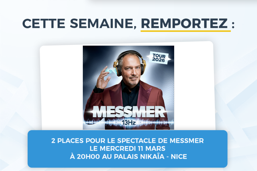 [JEU CONCOURS FACEBOOK - CANNES LERINS TV ET RADIO] Du 23/02/2026 au 27/02/2026, tentez de gagner 2 places pour le spectacle de Messmer le 11 mars au Palais Nikaia ! Pour participer : "Aimez" cette publication et "identifiez 5 amis" en commentaire sur notre page facebook. "Abonnez vous" à notre page facebook. Répondez à la question : De quel pays est originaire Messmer? 1) Belgique 2) Suisse 3) Canada 2 places seront tiré au sort parmi les bonnes réponses et attribuées à 1 gagnant le 27/02/2026. Jeu réservé à la France métropolitaine. ...
