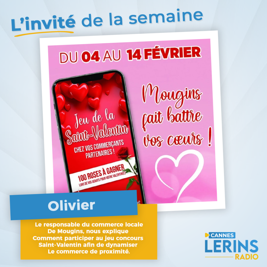 Dans l'émission l'invité de la semaine, Loric reçoit Olivier Responsable du Commerce Locale à Mougins et lance avec les commerçants un jeu spécial Saint Valentin du 4 février au 14 février afin de dynamiser les commerces de proximité. Présentation et questions / réponses sont au programme de cet interview.