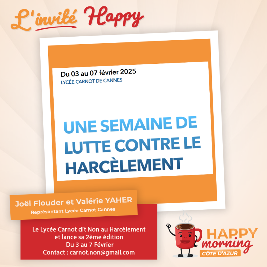 Dans l'émission happy morning Côte d'Azur, Loric reçoit Monsieur le Proviseur Joël Flouder et Valérie Yaher pour l'événement contre le harcèlement lycée Carnot de cannes. Présentation et questions / réponses sont au programme de cet interview.