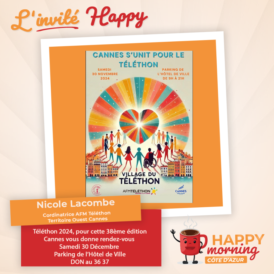 Dans l'émission happy morning Côte d'Azur, Loric reçoit Nicole Lacombe de l'AFM Téléthon du territoire Ouest Cannes. Présentation et questions / réponses sont au programme de cet interview.