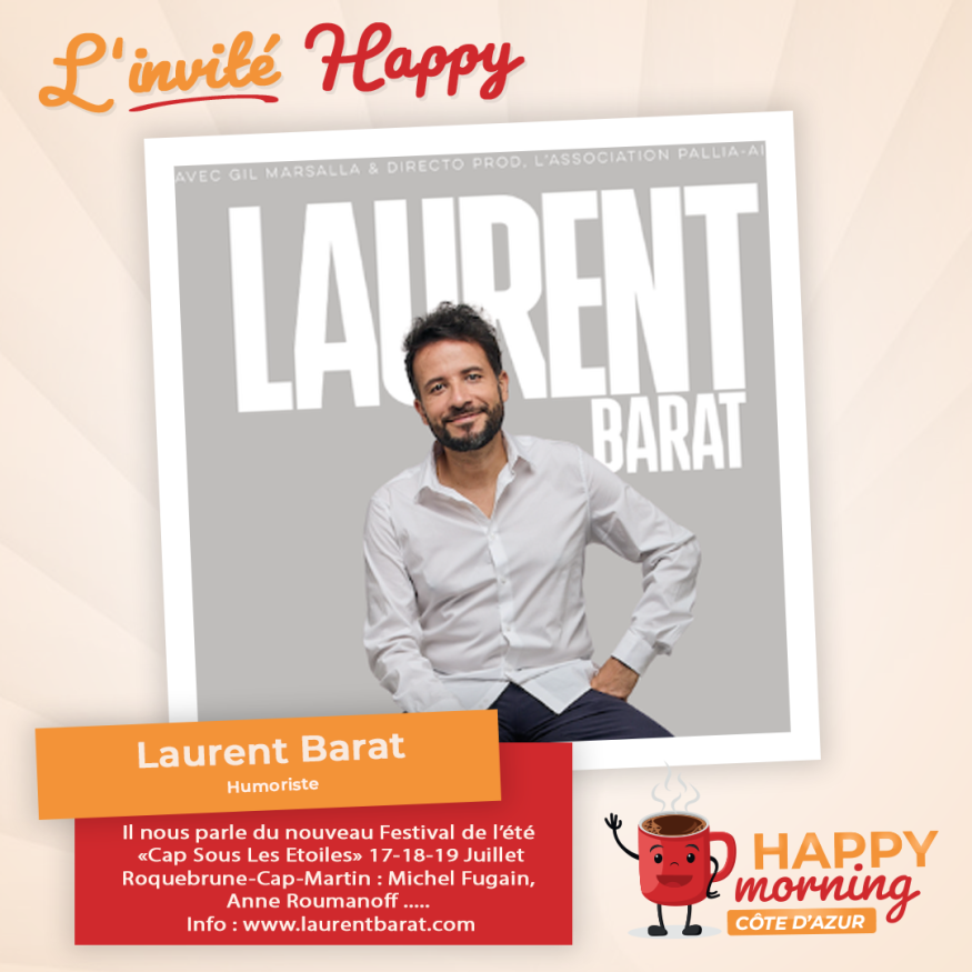 Dans l'émission happy morning Côte d'Azur, Loric reçoit l'humoriste Laurent Barat en spectacle pour la bonne cause. Présentation et questions / réponses sont au programme de cet interview.