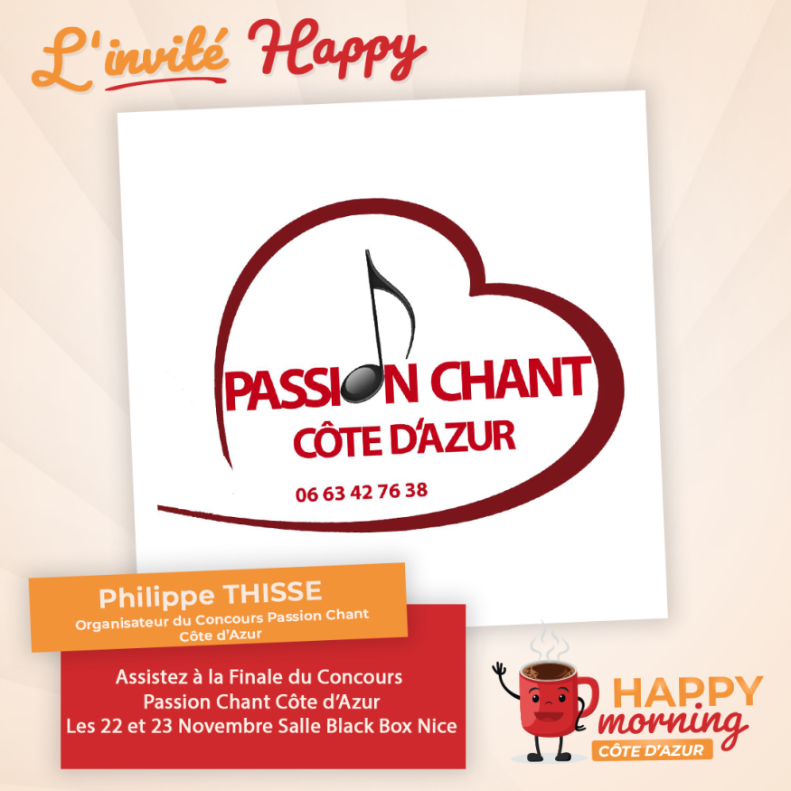 Dans l'émission happy morning Côte d'Azur, Loric reçoit Philippe Thisse Organisateur du concours Passion Chant. Présentation et questions / réponses sont au programme de cet interview.