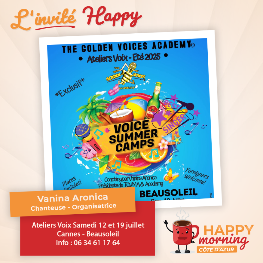 Dans l'émission happy morning Côte d'Azur, Loric reçoit Vanina Aronica de The Golden Voices Académy pour les Ateliers Voix Eté 2025. Présentation et questions / réponses sont au programme de cet interview.