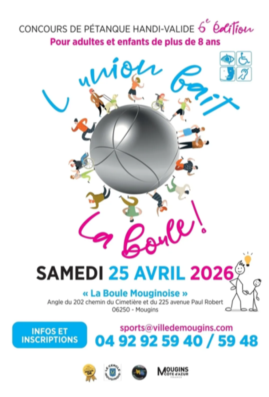 À Mougins, le sport rime avec partage. Le samedi 25 avril, rendez-vous pour “L’Union fait la Boule”, un concours de pétanque pas comme les autres. Organisé au boulodrome, cet événement handi-valide réunit joueurs valides et personnes en situation de handicap pour une journée placée sous le signe de la convivialité et de la solidarité. Le tournoi est ouvert à tous, adultes comme enfants à partir de 8 ans, avec un seul objectif : jouer ensemble, échanger et passer un bon moment autour du cochonnet. Une belle façon de rappeler que, sur le terrain comme dans la vie, l’union fait vraiment la force… et la boule.