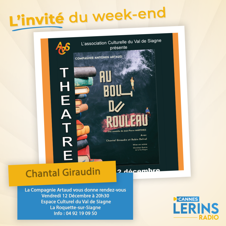 Dans l'émission l'invité du week-end, Loric reçoit Chantal Giraudin Comédienne issue du Conservatoire d’Art Dramatique de Nantes nous parle de la pièces "Au bout du rouleau" qu'elle interprètera avec le Comédie Robin Delval le vendredi 12 décembre à l'Espace Culturel du Val de Siagne à la Roquette-sur-Siagne info au 04 92 19 09 50 . Présentation et questions / réponses sont au programme de cet interview.