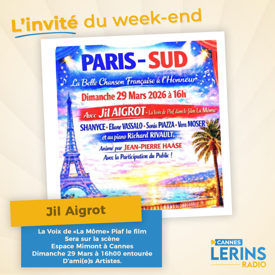 Dans l'émission l'invité du week-end, Loric reçoit Jil Aigrot la voix de Piaf dans le film "La Môme" qui sera en concert le Dimanche 29 Mars à 16h à l'Espace Mimont à Cannes avec PARIS-SUD accompagnée par ses ami(e)s artistes sous l'orgnisation de Cyril Benjamin Castro. Présentation et questions / réponses sont au programme de cet interview.