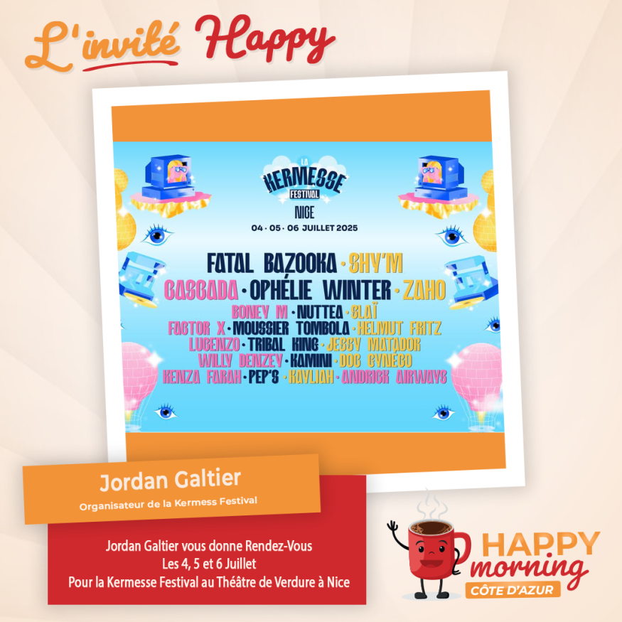 Dans l'émission happy morning Côte d'Azur, Loric reçoit Jordan Galtier Organisateur de "La Kermesse Festival" qui aura lieu les 4, 5 et 6 au Théâtre de Verdure de Nice. Présentation et questions / réponses sont au programme de cet interview.