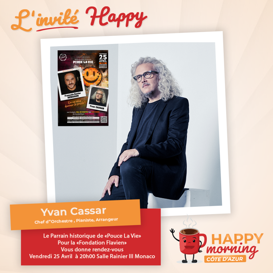 Dans l'émission happy morning Côte d'Azur, Loric reçoit Yvan Cassar Chef d'Orchestre Pianiste, Arrangeur de Johnny Hallyday, Mylène Farmer, Roberto Alagna et bien d'autres..., il sera en concert dans le cadre de "Pouce La Vie" pour la Fondation Flavien à Monaco le 25 Avril Salle Rainier III. Présentation et questions / réponses sont au programme de cet interview.