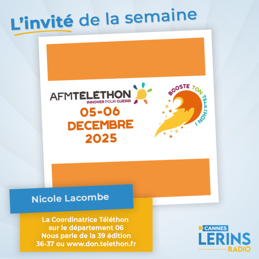 Dans l'émission l'invité de la semaine, Loric reçoit Nicole Lacombe Coordinatrice du Téléthon sur le département 06 nous parle de la 39ème édition du Téléthon du côté de Cannes entre autre... . Présentation et questions / réponses sont au programme de cet interview.